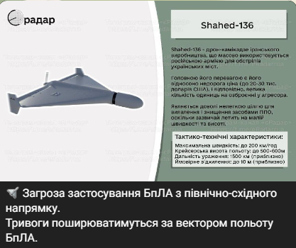 Повідомляється, що є загроза застосування БпЛА з північно-східного напрямку.