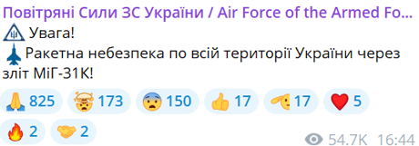 "Увага! Ракетна небезпека по всій території України через зліт МіГ-31К!", — йдеться у повідомленні.