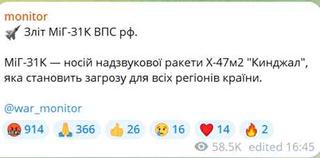 Також про небезпеку для українців через зліт ворожого винищувача попередив моніторинговий Telegram-канал monitor.