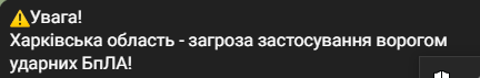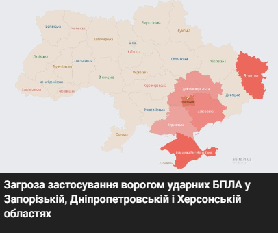 Повітряні Сили України повідомляють, що є загроза застосування ворогом ударних БпЛА у Запорізькій та Дніпропетровській областях. Рух БпЛА типу "шахід" з південного напрямку.