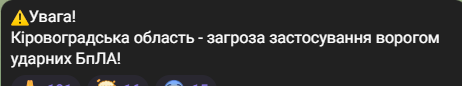 Повітряна тривога також лунає у Кіровоградській області.