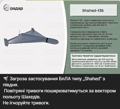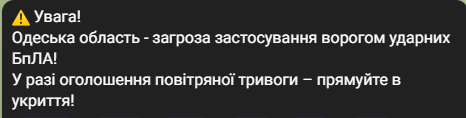 Моніторингові канали повідомляють, що існує загроза застосування БпЛА типу ,,Shahed" з півдня.