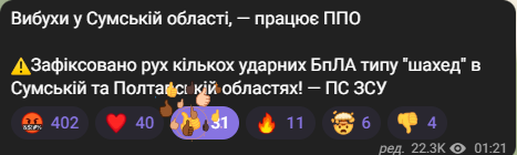 Вночі 21 червня в кілької областях України оголошена повітряна тривога. Зокрема, у Сумській, Полтавській та Черкаській. Кілька вибухів пролунало у Сумській області.