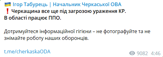 В області працює ППО", — повідомляє очільник Черкаської ОВА Ігор Табурець.