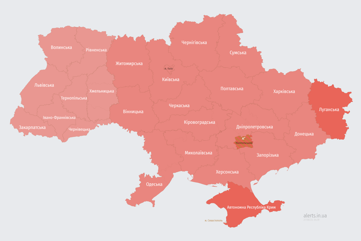 Додамо, що повітряна тривога вночі, 27 серпня, охопила Україну, "почервоніли" всі області. Ворог атакує ракетами, є небезпека удару.