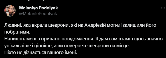 "Напишіть мені в приватні повідомлення. Я дам вам взамін щось значно унікальніше і цінніше, а ви повернете шеврони на місце. Ніхто не дізнається вашого імені", — закликає Меланія Подоляк.