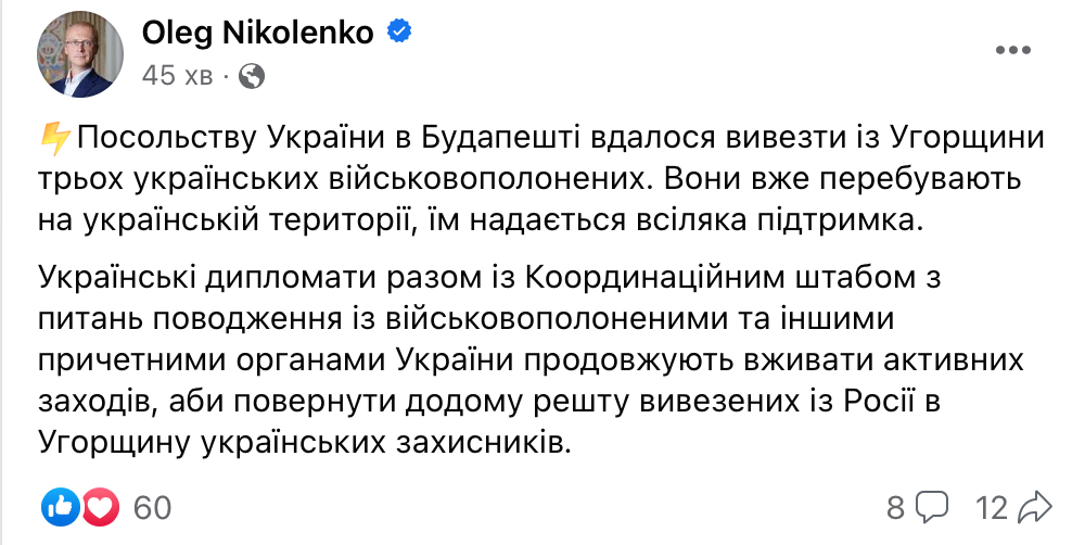 "Посольству України в Будапешті вдалося вивезти із Угорщини трьох українських військовополонених. Вони вже перебувають на українській території, їм надається всіляка підтримка. Українські дипломати разом із Координаційним штабом з питань поводження із військовополоненими та іншими причетними органами України продовжують вживати активних заходів, аби повернути додому решту вивезених із Росії в Угорщину українських захисників", — написав Ніколенко на своїй офіційній Facebook-сторінці.