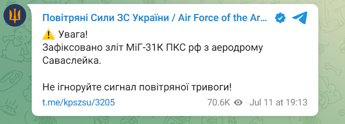 В Україні знову лунає повітряна тривога. Повідомляється про виліт МіГ-31К.
