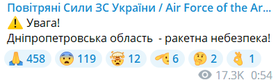 Оновлено 00:57. Також у Повітряних силах повідомляють про ракетну загрозу для Дніпропетровської області, куди поширилася повітряна тривога.