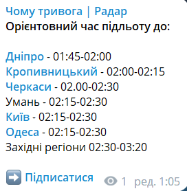 Оновлено 01:06. Орієнтовний час підльоту ракет за даними моніторингових каналів.