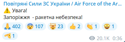 Оновлено 00:39. Повітряні сили попередили про ракетну небезпеку в Запоріжжі.