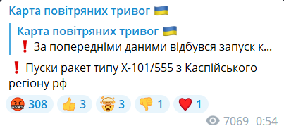 Оновлено 01:14. "Ракети (імовірно Х-101/Х-555) прямують у Південно-Східному напрямку. Курс може змінюватись", — попередили Повітряні сили.