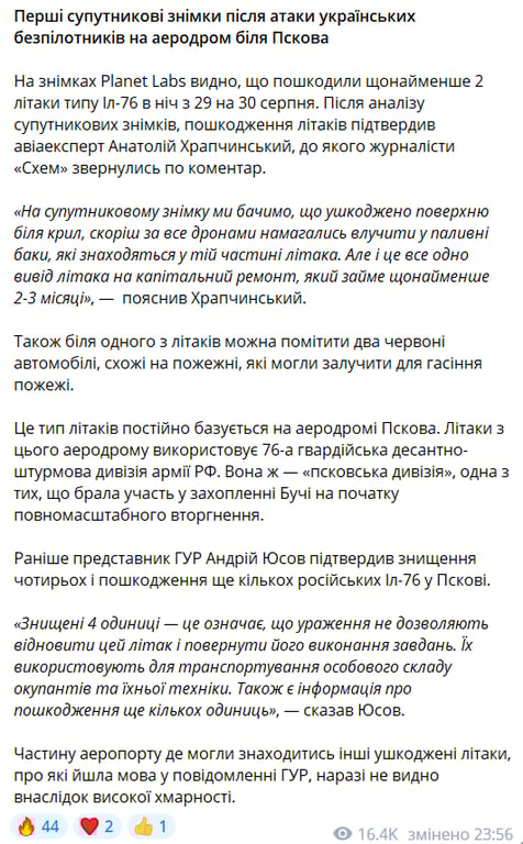 Зазначається, що пошкодження російських літаків підтвердив авіаексперт Анатолій Храпчинський після детального аналізу.