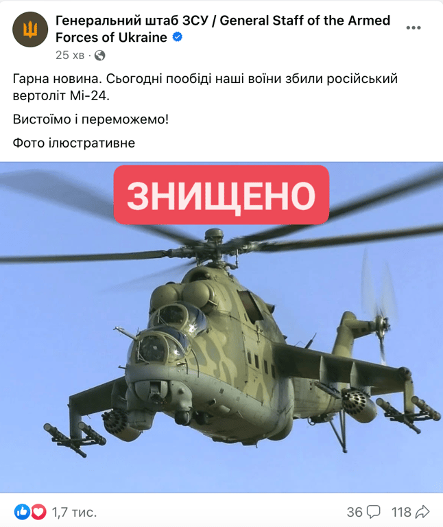 Збройні сили України уразили чергову ціль у небі — російський вертоліт Мі-24.